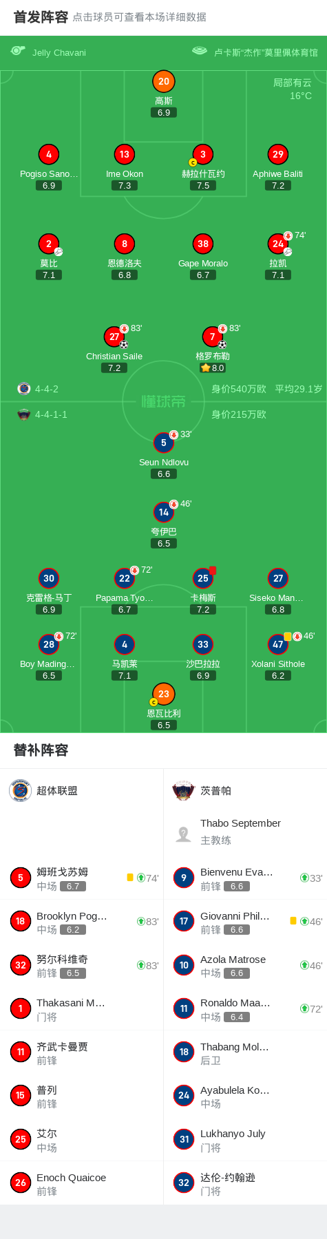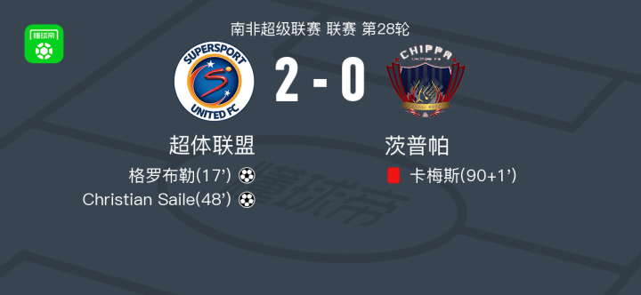 北京时间5月3日,南非超级联赛第28轮,超体联盟主场迎战茨普帕。比赛中,超体联盟凭借格罗布勒和Christian Saile的进球取得领先。下半场补时阶段,茨普帕队的卡梅斯被红牌罚下。最终,超体联盟以2-0战胜茨普帕。