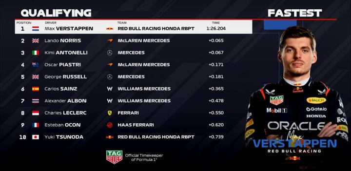 第1-第5:维斯塔潘、诺里斯、安东内利、皮亚斯特里、拉塞尔