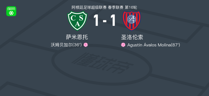 北京时间5月4日,阿根廷足球超级联赛春季联赛第16轮,萨米恩托主场迎战圣洛伦索。比赛中,圣洛伦索由沃姆贝加尔不慎自摆乌龙,为对手送上一分;随后,萨米恩托的Agustín Ávalos Molina同样出现失误,将球送入自家球门。最终,双方以1-1的比分握手言和。