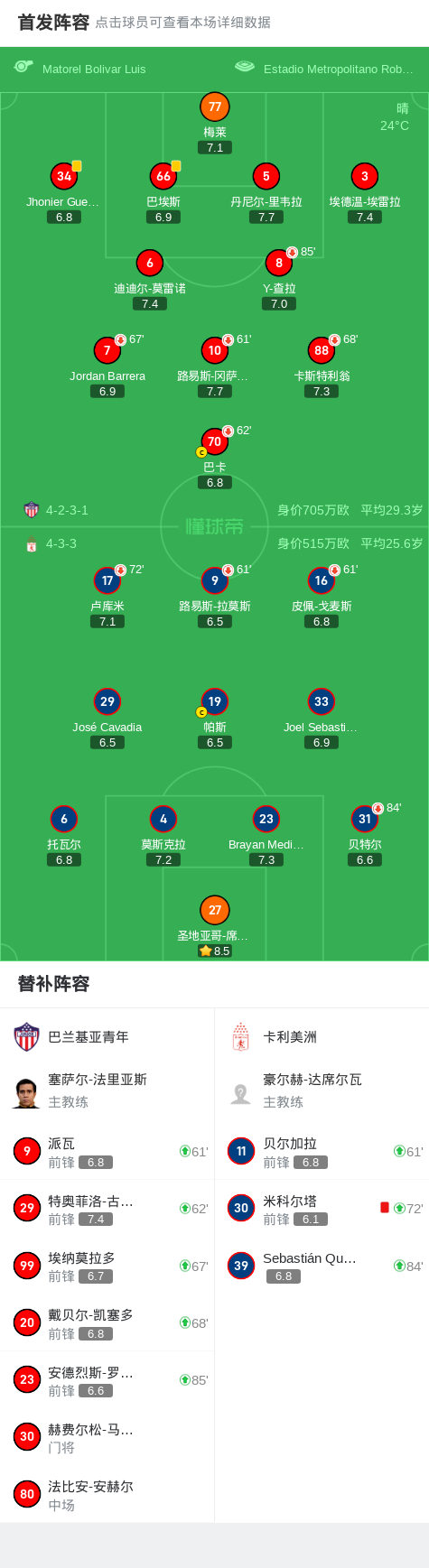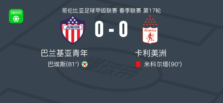 巴兰基亚青年0-0卡利美洲,双方破门乏术战报bot @懂球帝2025-05-04 11:28北京时间5月4日哥伦比亚足球甲级联赛 春季联赛 第17轮,巴兰基亚青年主场对阵卡利美洲。最终比分巴兰基亚青年 0-0 卡利美洲。点击查看本场比赛详细数据>>点击查看哥伦甲完整积分榜>>精彩瞬间第81分钟,巴兰基亚青年球员巴埃斯将点球罚丢。第90分钟,卡利美洲球队米科尔塔吃到红牌。 球队阵容 技术统计 展开更多