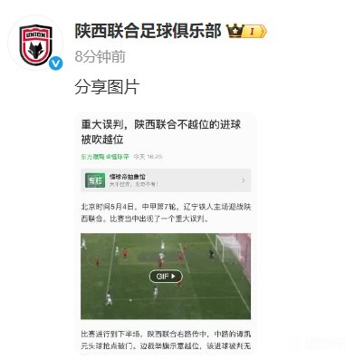 表明态度?陕西联合官方转发球队遭遇误判的新闻东方蹴鞠 @懂球帝2025-05-04 17:48北京时间5月4日,中甲第7轮,陕西联合客场1-2不敌辽宁铁人。比赛当中,陕西联合遭遇了一个较为明显的误判。下半场,陕西联合队谭凯元接到右路传中头球破门,但边裁举旗示意越位,此球被判无效。从慢动作看,在传球一瞬间,谭凯元明显不越位。赛后,陕西联合将懂球帝有关这个判罚的新闻截图转发到了其官方微博上,但并未再做进一步表态,或许是借此表达自己对于判罚的看法。展开更多