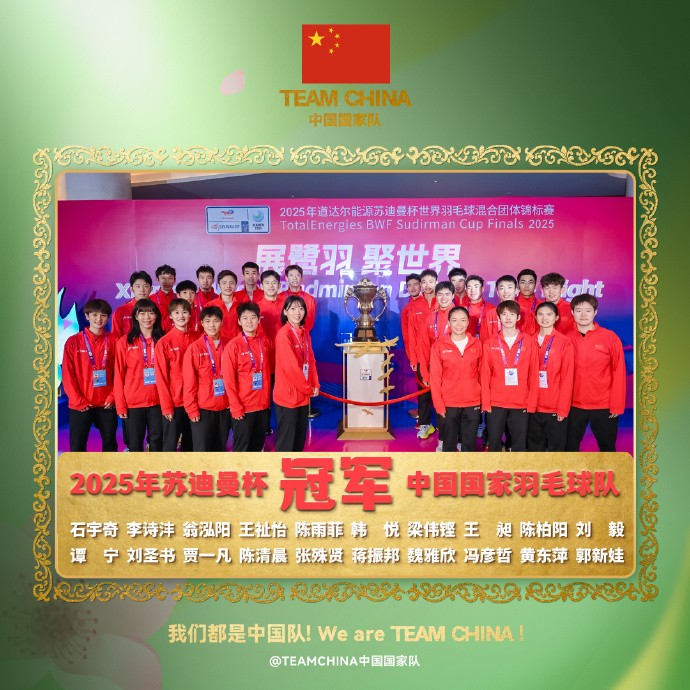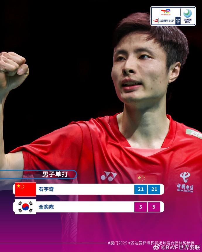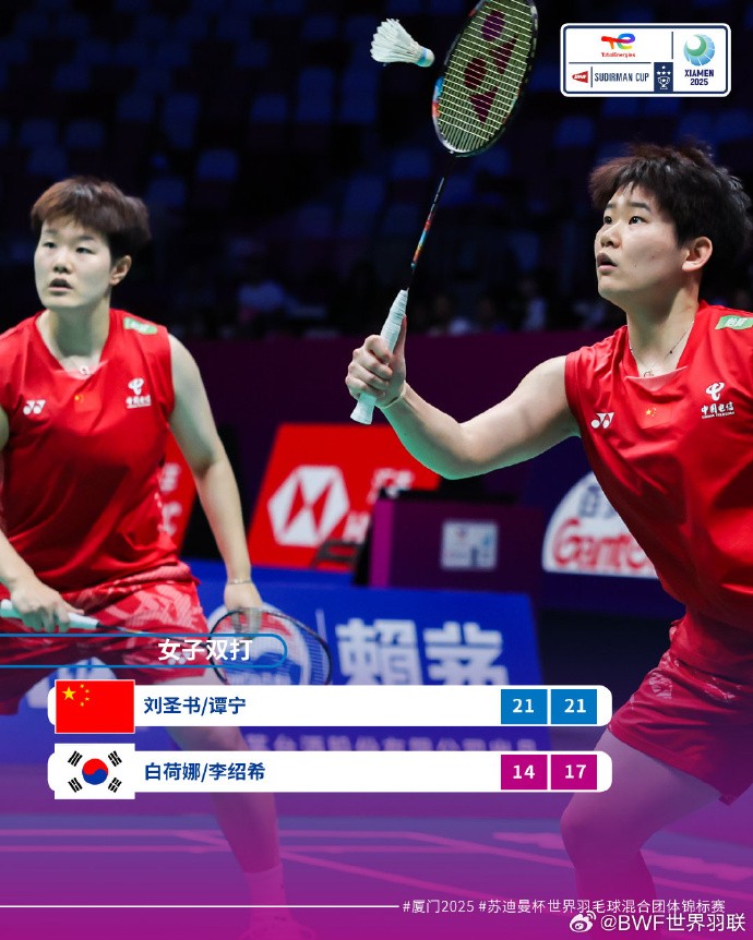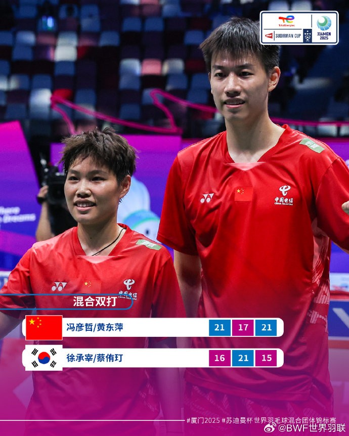 中国队3-1战胜韩国队,完成苏迪曼杯四连冠&第14次捧杯gaoniu @懂球帝2025-05-04 18:405月4日,苏迪曼杯决赛中国队3-1战胜韩国队,历史上第14次夺得苏迪曼杯,也是史无前例的连续4次拿到冠军。具体赛况混双:冯彦哲/黄东萍2-1(21-16、17-21、21-15)徐承宰/蔡侑玎女单:王祉怡0-2(17-21、16-21)安洗莹男单:石宇奇2-0(21-5、21-5)全奕陈女双:刘圣书/谭宁2-0(21-14、21-17)白荷娜/李绍希展开更多