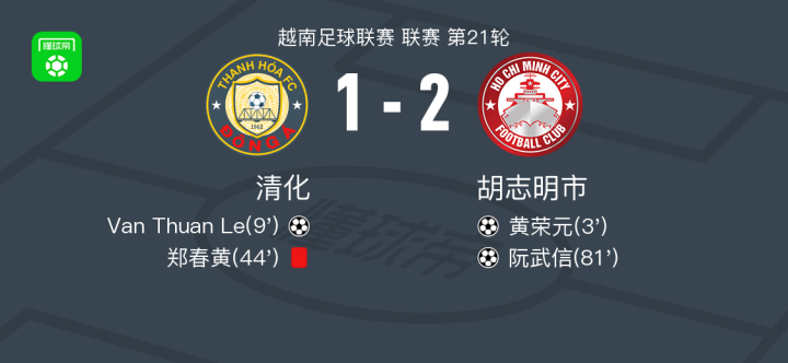 北京时间5月4日越南足球联赛 联赛 第21轮,清化主场对阵胡志明市。清化Van Thuan Le破门。胡志明市黄荣元破门,阮武信破门。最终比分FLC清化 1-2 胡志明市。