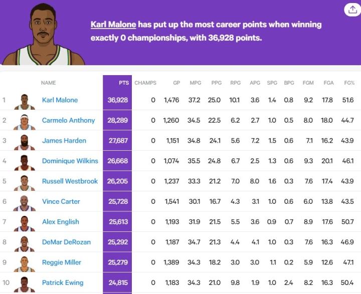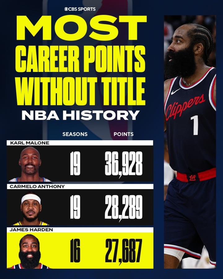 这是哈登职业生涯的第16个赛季,迄今为止他还未能夺得总冠军。美媒CBS Sports晒出了无冠球星的得分榜前三名,哈登仅次于“邮差”卡尔-马龙和“甜瓜”安东尼排在第三位。