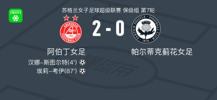 阿伯丁女足2-0帕尔蒂克蓟花女足,汉娜-斯图尔特破门,埃莉-考伊锦上添花