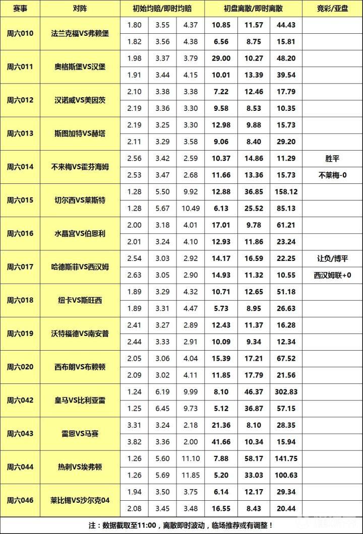 [关于离散] 是竞技彩票特有分析指数,指数基于百家欧赔即时赔率分歧度。基本原理是:百家欧赔平均值与每家赔率差值的绝对值的求和。离散度小则赔率公司观点接近,进而 彩果易打出,离散度大则反之意见分歧大,彩果不易打出。又因庄家操盘/变赔影响,离散低则概率高理论并非放之四海而皆准,需结合盘赔和基本面等信息综合运 用。简言之,离散是参考指标,而非填单依据!以下是各场数据汇总(数据截取至11:00):
