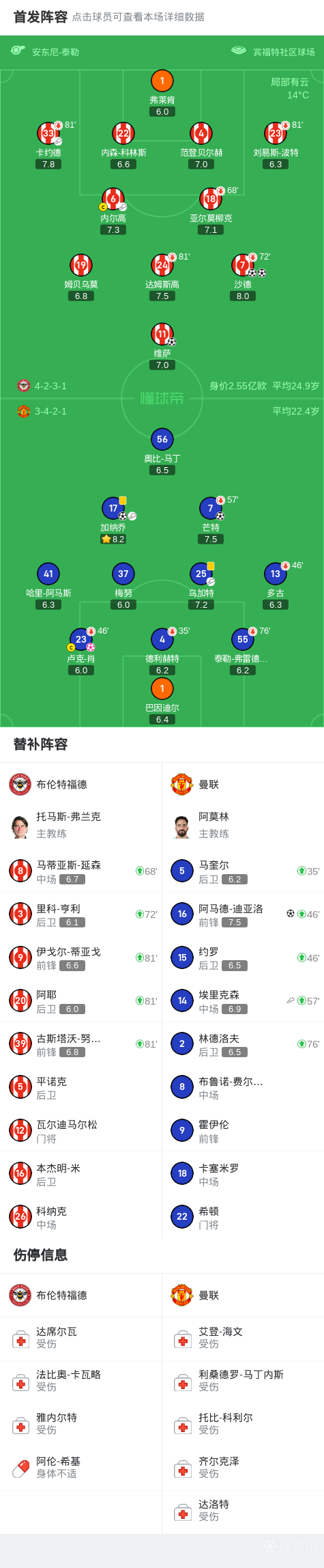 第73分钟,打花了,维萨轻松推空门得手,布伦特福德4-1曼联