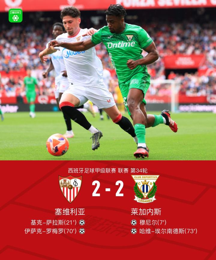 北京时间5月4日,西班牙足球甲级联赛第34轮,塞维利亚主场迎战莱加内斯。比赛中,莱加内斯由穆尼尔率先建功,塞维利亚随后由基克-萨拉斯扳平比分。此后,伊萨克-罗梅罗为塞维利亚反超比分,但莱加内斯凭借哈维-埃尔南德斯的进球再度将比分追平。最终,双方以2-2握手言和。