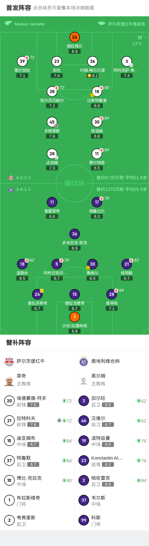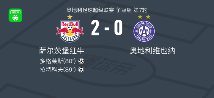 萨尔茨堡红牛2-0奥地利维也纳,多格莱斯破门,拉特科夫锁定胜局