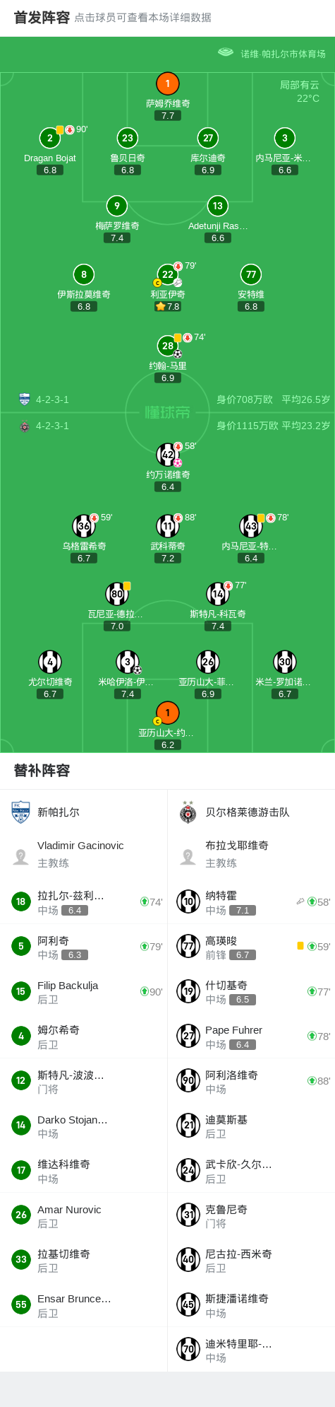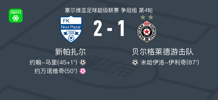 北京时间5月4日塞尔维亚足球超级联赛 争冠组 第4轮,新帕扎尔主场对阵贝尔格莱德游击队。新帕扎尔约翰-马里破门。贝尔格莱德游击队米哈伊洛-伊利奇破门,约万诺维奇自摆乌龙。最终比分新帕扎尔 2-1 贝尔格莱德游击队。