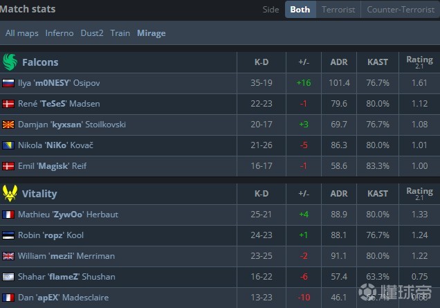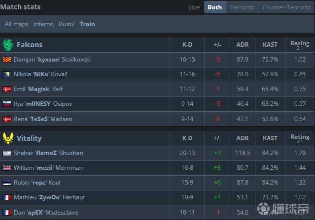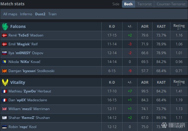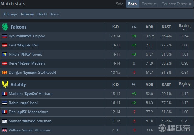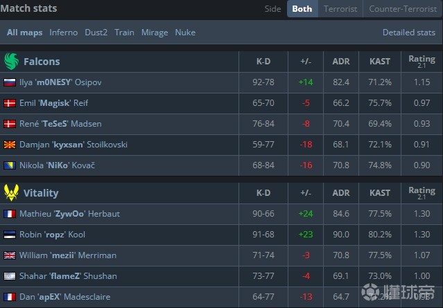 ropz依靠一波不讲理四杀带领VIT带着2分的优势结束上半场,换边后小蜜蜂在CT方轰出一波6-1终结比赛,全队4绿打5红,展现出在火车中的理解压制。