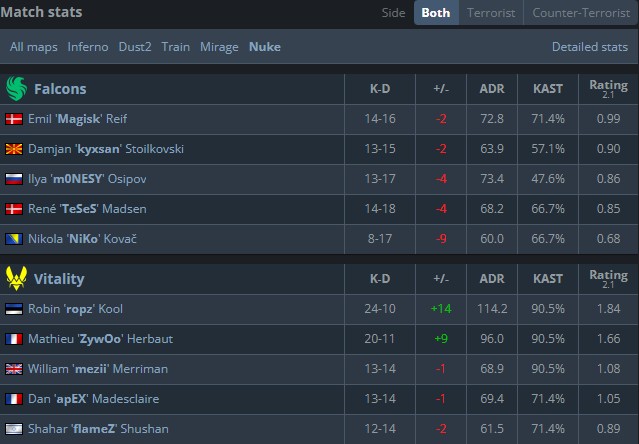 猎鹰在开局被翻后牢牢掌握住比赛的控制权,第8回合仅用5把手枪就速通B区,上半场9-3领先,并一度以12-3的比分获得9个局点。但此后小蜜蜂再次展现出超强的韧性,不断将比分迫近,ZywOo在第24回合大心脏完成1v2转点残局,以一个四杀将比赛拖入加时。