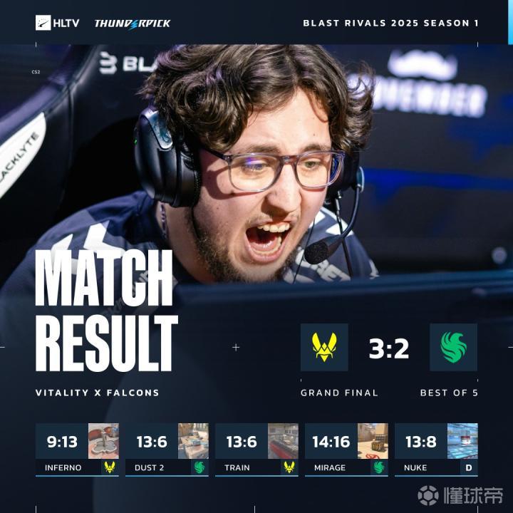 北京时间5月5日凌晨,CS2赛事BLAST Rivals S1总决赛,Vitality再遇Falcons,并又一次以3-2的大比分胜出,夺得冠军!