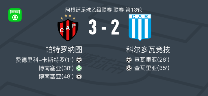 北京时间5月5日,阿根廷足球乙级联赛第13轮,帕特罗纳图主场迎战科尔多瓦竞技。比赛开始后,帕特罗纳图迅速取得领先,费德里科-卡斯特罗为球队首开纪录。随后,科尔多瓦竞技展开反击,查瓦里亚在比赛中两次破门,帮助球队实现反超。关键时刻,帕特罗纳图的博南塞亚挺身而出,他先是罚入一粒点球,随后又打入一球完成梅开二度,为球队锁定胜局。最终,帕特罗纳图以3-2战胜科尔多瓦竞技。