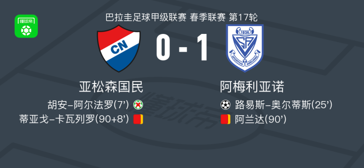 北京时间5月5日,巴拉圭足球甲级联赛春季联赛第17轮,亚松森国民主场迎战阿梅利亚诺。比赛中,亚松森国民曾获得点球机会,但胡安-阿尔法罗未能把握住,将球罚丢。阿梅利亚诺凭借路易斯-奥尔蒂斯的进球取得领先,这粒进球由贝拉送出助攻。比赛尾声阶段,阿梅利亚诺的阿兰达因累计两张黄牌被罚出场,而亚松森国民的蒂亚戈-卡瓦列罗同样因吃到第二张黄牌离场。最终,亚松森国民主场0-1不敌阿梅利亚诺。
