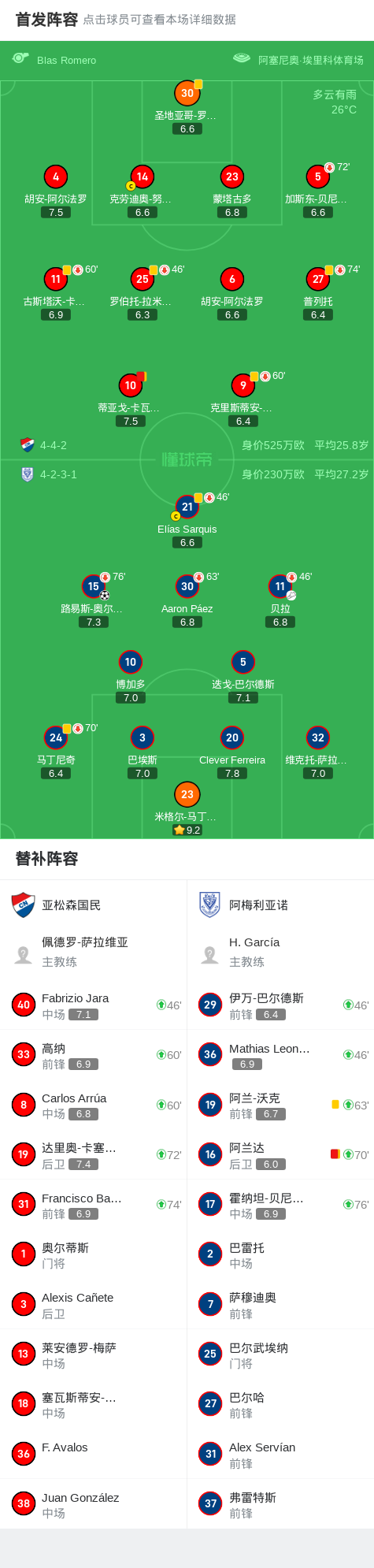 下半场补时第8分钟,亚松森国民球队蒂亚戈-卡瓦列罗吃到第二张黄牌。
