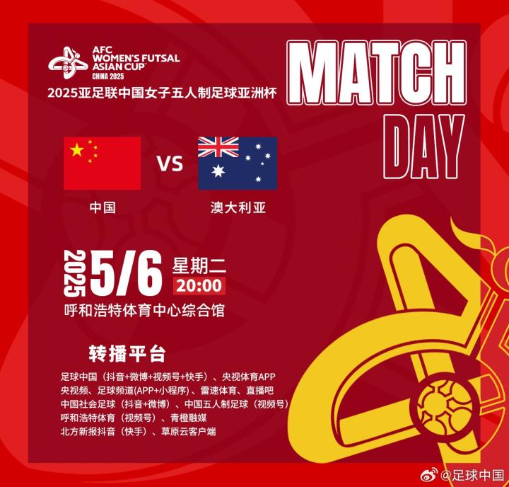 北京时间5月5日,足球中国官方公布了五人制女足亚洲杯的比赛转播计划。