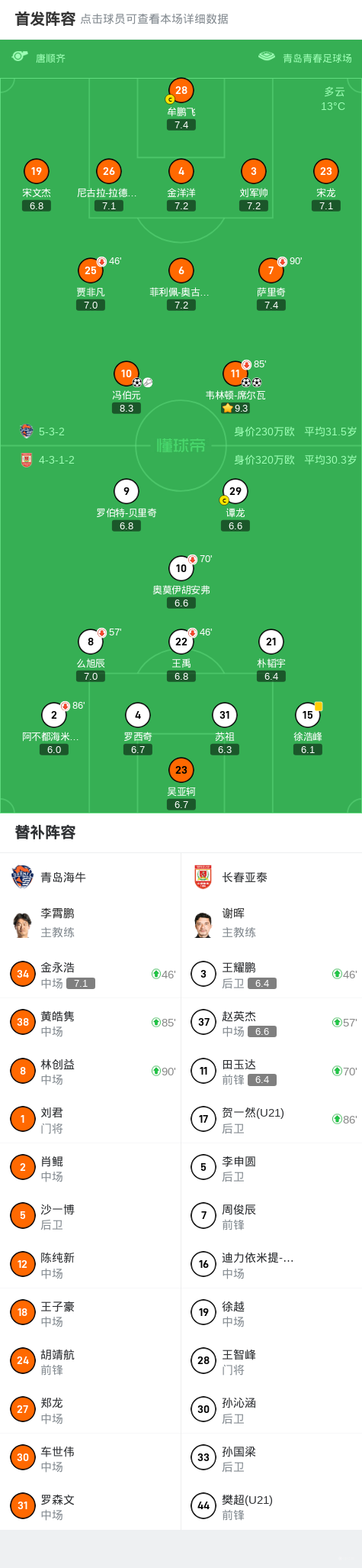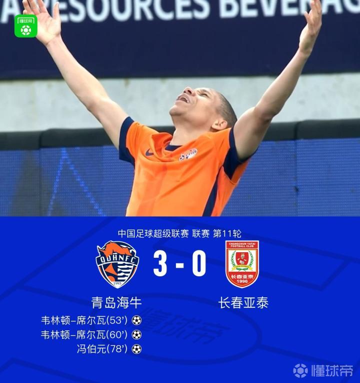 北京时间5月5日19:35,中超第11轮继续进行,青岛海牛坐镇主场青岛青春足球场迎战长春亚泰,本场主裁判为唐顺齐,VAR裁判为李海新。上半场,牟鹏飞高接低挡屡救险。下半场,韦林顿-席尔瓦完成梅开二度,冯伯元传射建功。最终,海牛主场3-0完胜亚泰,迎来赛季首胜。