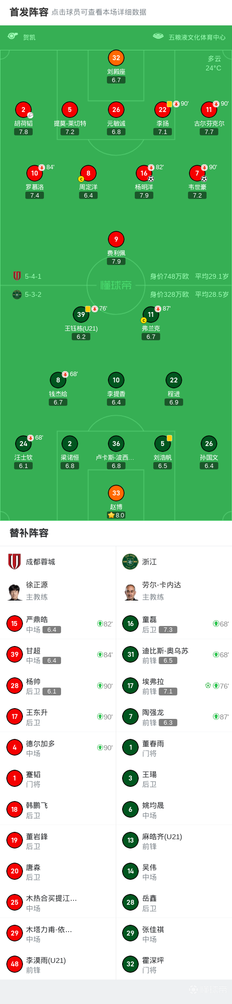 北京时间5月5日,中国足球超级联赛第11轮,成都蓉城主场迎战浙江。上半场,杨明洋一条龙突破后折射得分,下半场,韦世豪为成都队再下一城。比赛补时阶段,甘超送点,埃弗拉点射扳回一城。最终,成都蓉城2-1战胜浙江,迎来四连胜。