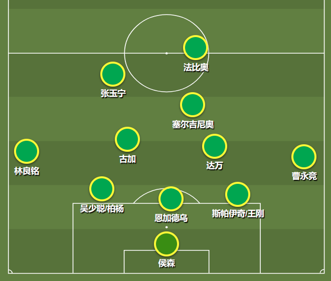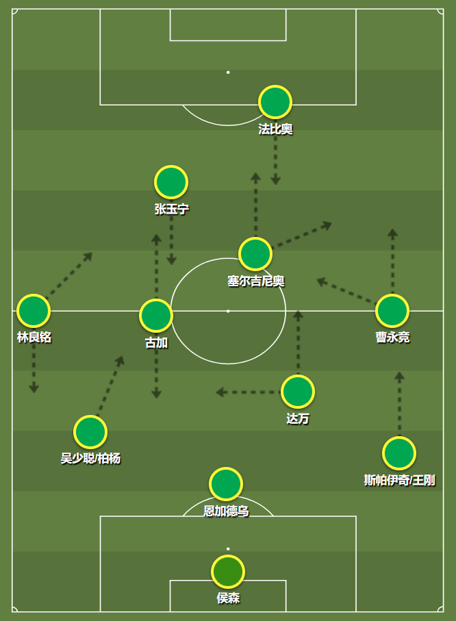 到这里应该会有朋友好奇,苏先生不也用的三中卫吗?苏亚雷斯的三中卫体系,在绝大部分情景中,三中卫都是落在后场的,在那一阶段,双中场经常性会与对方的三中场防线对位,防线一旦落回就会被盯人牵制,因此在去年苏先生的三中卫体系下,大量时间处在伪传控阶段,进攻的大体思路是大圈和边路起球,如果不是法比奥足够全面的中锋作业能力,去年国安的进球转化率会更低。当然,苏先生的四后卫体系要好很多,在防守反击阶段的表现也整体不错。