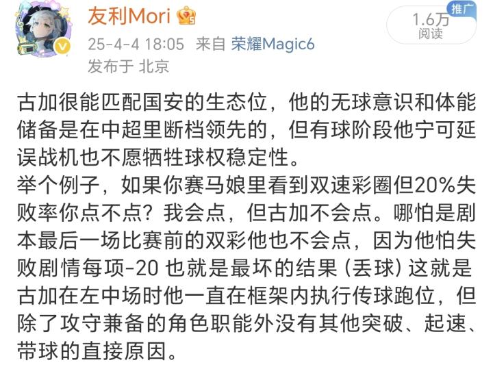 那么,古加为何非续不可呢?因为他能撑起的跑动量,能够跟上的比赛强度,以及他非常强的比赛阅读能力下的到位率。在后金元时代,古加这个级别的球员已经是非常高水平的了。他27岁的年纪不会让他在短时间内有身体机能的问题,起码在下一个合同期内,他仍然能作为国安中场稳定出勤的先发球员。可以回想一下,在强强对话中,一旦我们的某个环节断掉,比如后场受到压迫很难出球过渡球,比如前场很难挤开后卫完成接球梳理,比如中场很难完成背转身。在这种时候,就需要一个非常强的点通过无球带出更多的空间出来,能够高于这个比赛强度的球员才能强行打断对手的节奏,或是把节奏抢下来。如果理解不了这句话,可以看一下24/25赛季欧冠半决赛第一回合阿森纳vs巴黎上半场22分30秒前后,在斯凯利强行带球切进内线造出犯规获得宝贵气口的前后,此前阿森纳的被动和此后巴黎进攻开始无法持续压制的现象。古加就是这样一个能够把节奏撑起来的球员,因为他的体能储备远比我们国内球员和一些年纪上30的外援恐怖,他能做到在这一阶段保证自己的位置不出现问题,他能多跑,那么队友的压力就会被分担。这是强强对话下,古加在强度维持上的重要性,即使是只做横移防守和顶出破坏,古加也能让对手感觉到推进和组织时的乏力,因为在持续的消耗下,对手会出现疲态,而古加几乎不会,因为古加就在自己的既定位置上按部就班地执行任务,防守落位,进攻回到更深位置组织,在球运转到前场后连续冲刺来到肋部撑开空间,把整个结构强行撑起来。为什么国安开局到现在没有在比赛前期因为被动而导致局面迅速失控甚至崩盘,就是因为古加(也包括达万)能够维持住中路的比赛强度,即使被动,对手也很难把雪球滚起来,直到国安通过某一节点关键球员的反扑和发力,把失去的局面打回去。在对手强度相对低的比赛中,古加的作用会更加明显,古加几乎在每一次进攻情景中,都会做无球冲刺的工作,来到肋部带走对方想要顶出防守限制的防守人,而在攻守转换阶段,你又会看到一个葡萄牙小个冲刺到弧顶处完成拦截和破坏。在对手视角下,这就是一个你打不出体能问题的永动机,即使他不需要带球和过人,他也能通过撞墙和触球跑位完成任务,这样的b2b角色球员,因为中超强度下体能几乎不会让他出现严重疲劳问题,试问这种球员不值得一个续约合同吗?塞蒂恩现阶段认识到了古加在【强度】上的恐怖之处,因此设置了他这样一个绿叶角色定位的不对称中场站位,如果塞蒂恩能够适时地给到古加一些轮休的时间,那么本赛季国安的中轴线将会是非常稳固的。因此我无比认同法比奥的那句话:“人们总是对古加说这说那,结果呢?古加进球助攻了。”,古加为这支国安带来的不止是数据,进球和助攻不是足球的全部,我们不能忽视他在攻守两端作为绿叶角色做出的贡献,这样的付出是塞蒂恩体系能够顺利运转的关键,这样的球员,我们不应该给他递上一份续约合同吗?这并非为古加发声,而是我认为我们应该更合理全面地看待这位球员,在他延误战机时,我也会表达对他的不满,但当他在无球阶段“做多”时,请大家也要正式他的付出。这是一位职业态度非常好的球员。古加自己也知道自己的不足,他在专访中提到过他自己认为自己是一个需要和队友产生联系的“做墙式球员”,他也知道凭借自己一己之力无法把球带出来,他没有比埃拉、巴塔拉那样的小基数能力,但他也在用更多的跑动覆盖去弥补自己盘带小技术的缺陷。作为球迷,我们应该给到古加更多的支持。