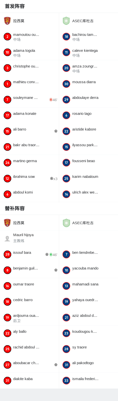 第25分钟,拉西莫球员souleymane kane助攻ibrahima sow打入一球。