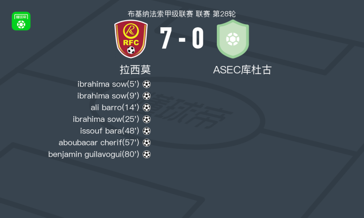 拉西莫7-0狂胜ASEC库杜古,ibrahima sow帽子戏法,benjamin guilavogui破门