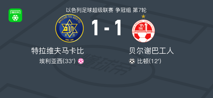 特拉维夫马卡比1-1贝尔谢巴工人,比顿破门