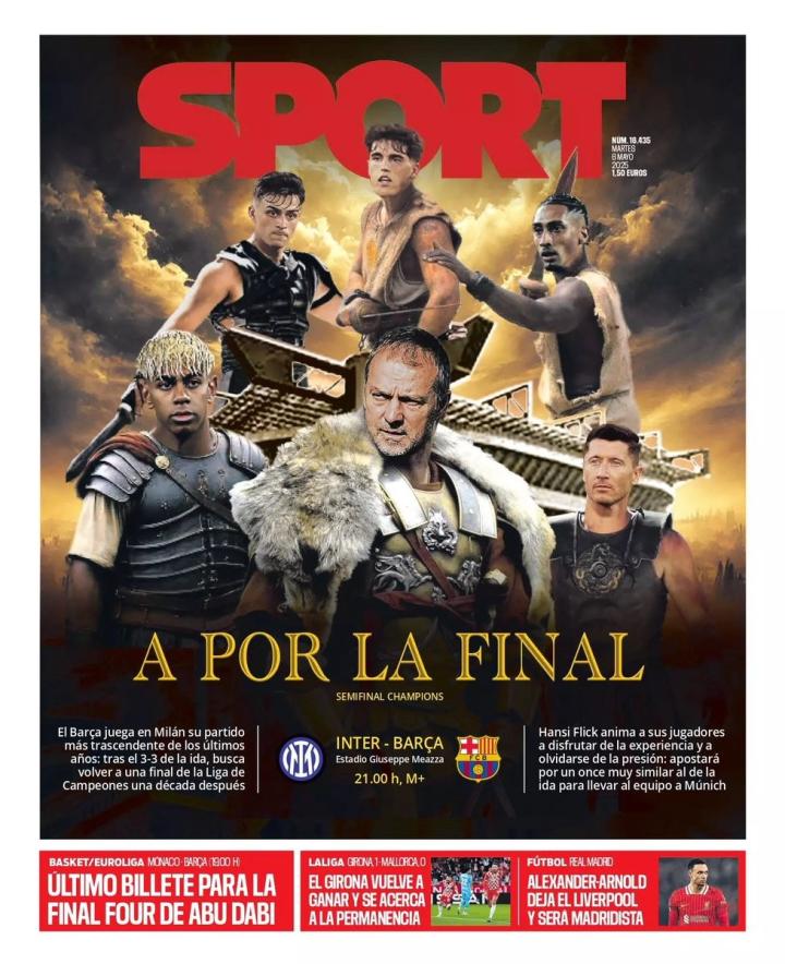 《每日体育报》称巴萨将迎来十年来首次打入欧冠决赛的大好机会。弗里克的球队面对一支极具威胁、同样渴望晋级决赛的国际米兰,注定不会轻松。“冲击决赛”是本周二《每日体育报》的史诗级封面标题。