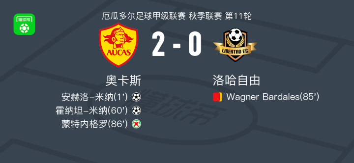 北京时间5月6日厄瓜多尔足球甲级联赛 秋季联赛 第11轮,奥卡斯主场对阵洛哈自由。奥卡斯安赫洛-米纳破门,霍纳坦-米纳破门。最终比分奥卡斯 2-0 洛哈自由。