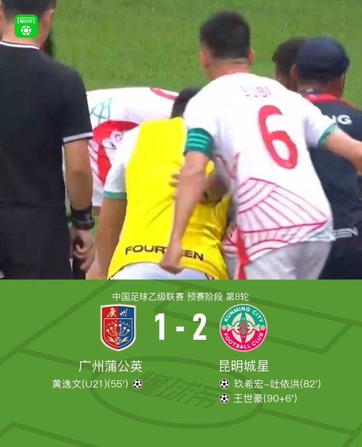 北京时间5月6日,中国足球乙级联赛预赛阶段第8轮,广州蒲公英主场迎战昆明城星。比赛中,广州蒲公英依靠黄逸文的进球取得领先。昆明城星随后由玖希宏-吐依洪扳平比分,并通过王世豪的进球实现反超。最终,广州蒲公英以1-2不敌昆明城星。