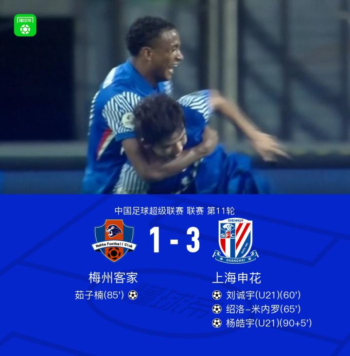 北京时间5月6日,中国足球超级联赛第11轮,梅州客家坐镇主场迎战上海申花。下半场刘诚宇攻入个人中超首球,随后马纳法右路传中,米内罗头球破门,之后茹子楠禁区外抽射扳回一球,补时阶段米内罗送助攻,杨皓宇斩获个人中超首球。最终申花3-1战胜梅州。