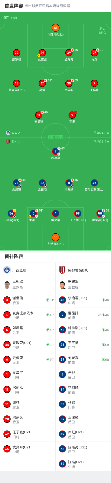成都蓉城B队4-0客胜十人广西蓝航,余彦锋闪击,王斯染红