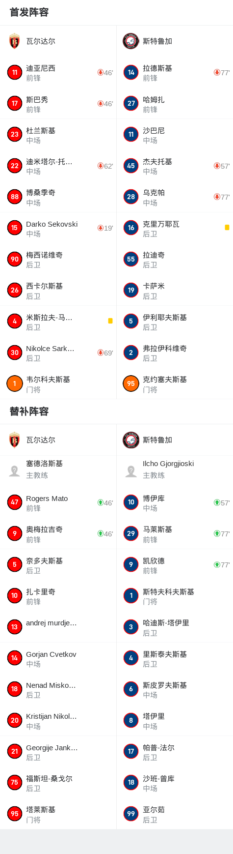 瓦尔达尔0-0斯特鲁加,双方握手言和战报bot @懂球帝2025-05-07 00:47北京时间5月6日,北马其顿甲组足球联赛第31轮,瓦尔达尔主场迎战斯特鲁加。全场比赛双方均未能取得进球,最终瓦尔达尔与斯特鲁加互交白卷,以0-0的比分握手言和。点击查看本场比赛详细数据>>点击查看北马其甲完整积分榜>> 球队阵容 展开更多