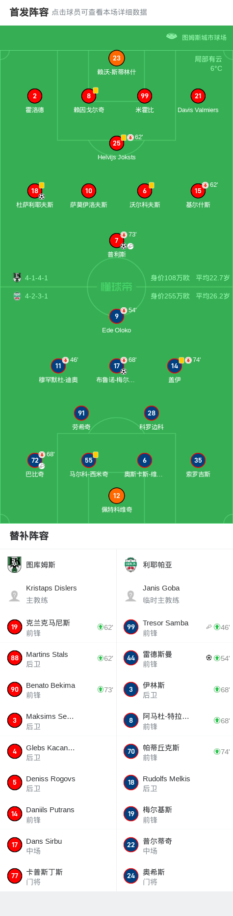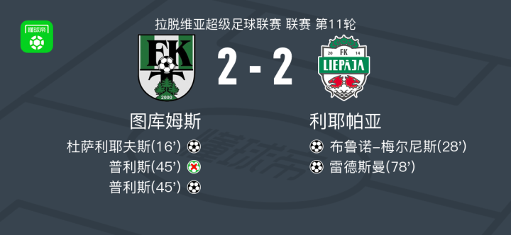 在北京时间5月6日进行的拉脱维亚超级足球联赛第11轮比赛中,图库姆斯主场迎战利耶帕亚。图库姆斯由杜萨利耶夫斯率先建功,普利斯随后锦上添花;利耶帕亚方面,布鲁诺-梅尔尼斯扳平比分,雷德斯曼则打入关键一球帮助球队再度追平。尽管普利斯错失了一次点球机会,但最终双方以2-2的比分握手言和。