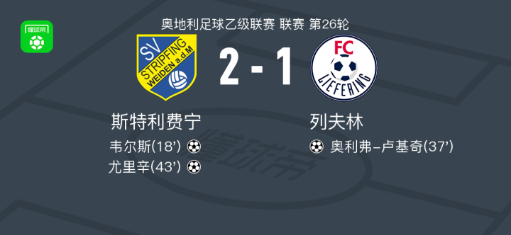 北京时间5月7日,奥地利足球乙级联赛第26轮,斯特利费宁主场迎战列夫林。比赛中,斯特利费宁的韦尔斯接尤里辛助攻率先破门,随后列夫林由奥利弗-卢基奇扳平比分。不久后,尤里辛在韦尔斯的助攻下再入一球,帮助斯特利费宁再度领先。最终,斯特利费宁以2-1战胜列夫林。