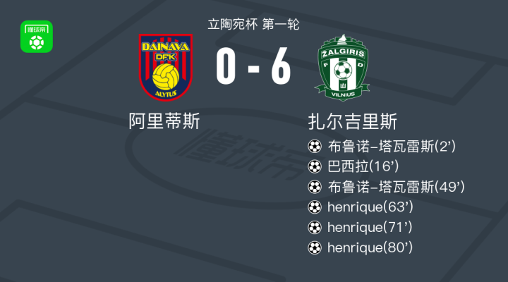 扎尔吉里斯6-0血洗阿里蒂斯,henrique帽子戏法,布鲁诺-塔瓦雷斯两球