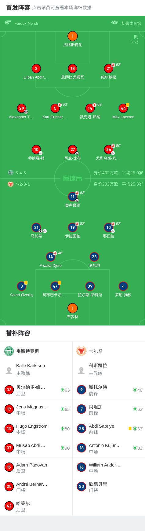 第36分钟,韦斯特罗斯球员尤利乌斯-约翰松助攻Alexander Thongla-Iad Warneryd打入一球。