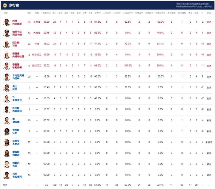印第安纳步行者迈尔斯-特纳23分8板1助1断5帽,内史密斯23分4板1助1断3帽,马图林19分2板1助。
