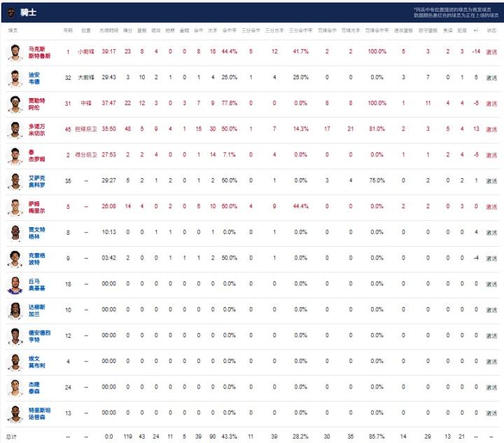 克利夫兰骑士米切尔48分5板9助,斯特鲁斯23分8板4助,艾伦22分12板3助;印第安纳步行者迈尔斯-特纳23分8板,内史密斯23分4板,哈利伯顿19分9板4助。