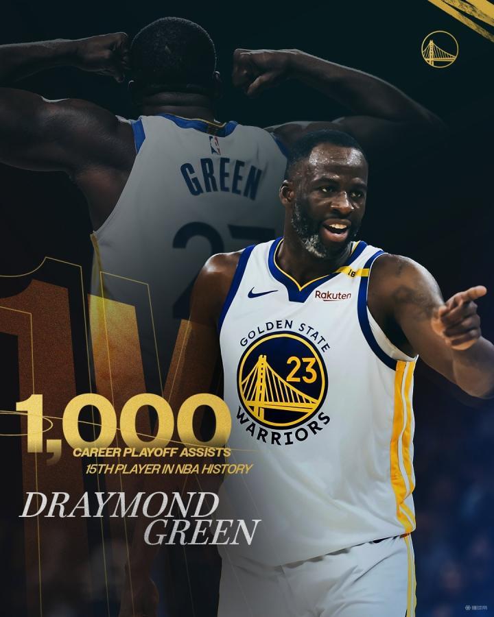 本场比赛,追梦格林拿到了6次助攻,自此他也成为了NBA历史上第15位季后赛助攻数突破1000大关的球员。