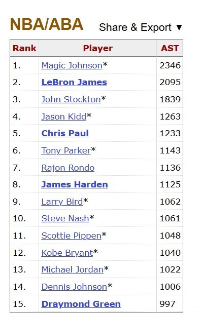 目前排在追梦身前的是丹尼斯-约翰逊,他距离后者仅3个助攻的差距,再往前是迈克尔-乔丹。