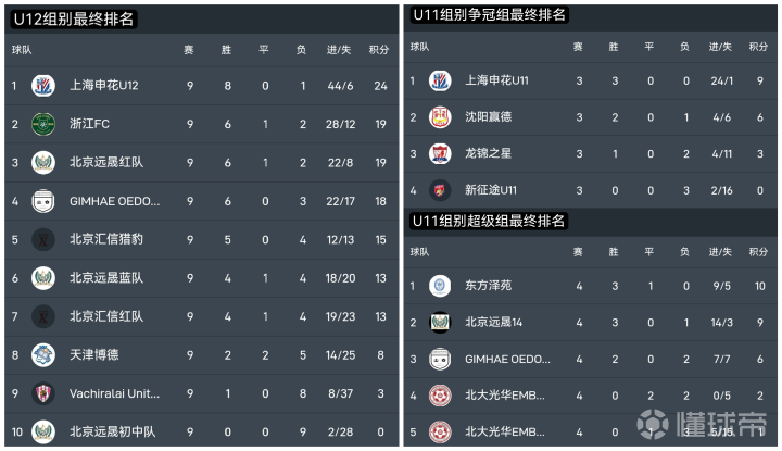 经过四天的激战,最终来自上海申花的U11和U12两支梯队包揽冠军,并且拿下全部个人奖项。上海申花U11在定级赛阶段8轮全胜,进入争冠组后再次横扫对手,保持3场全胜夺得U11组别冠军。从定级赛到争冠站,申花U11在11场比赛总共打进45球,仅丢3球,其中诸致宇打进10球。上海申花U12同样火力全开,在9轮比赛中8胜1负夺得冠军,总共打进44球,丢掉6球。