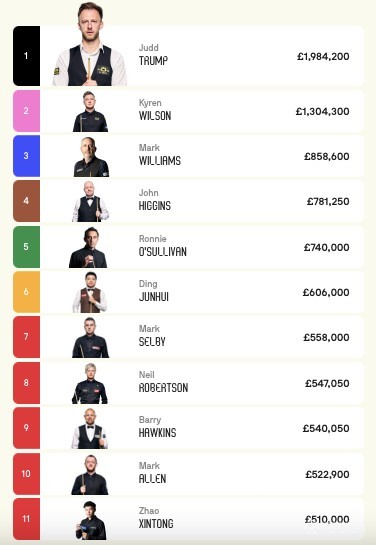 5月7日,随着斯诺克世锦赛的结束,2024-25赛季的世界排名最终落定,特鲁姆普稳居世界第一,丁俊晖排名第6,赵心童凭借世锦赛冠军蹿升到第11位。