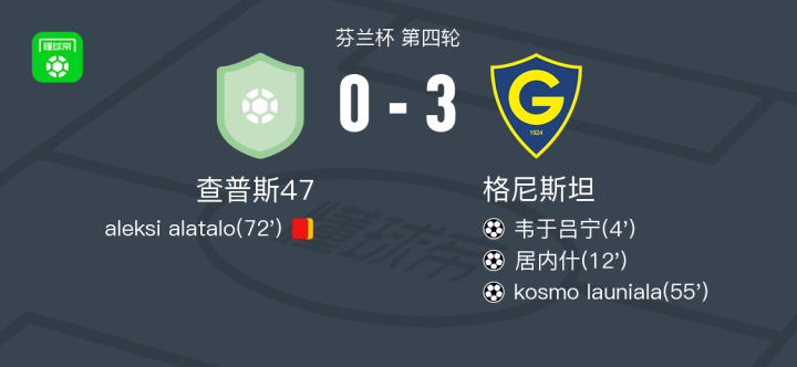 北京时间5月7日芬兰杯第四轮,查普斯47与格尼斯坦展开较量。比赛中,韦于吕宁率先为格尼斯坦打破僵局,随后居内什再下一城扩大优势,kosmo launiala锦上添花锁定胜局。此外,查普斯47队的aleksi alatalo因累计两张黄牌被罚下场。最终,格尼斯坦以3-0战胜查普斯47,成功晋级下一轮。