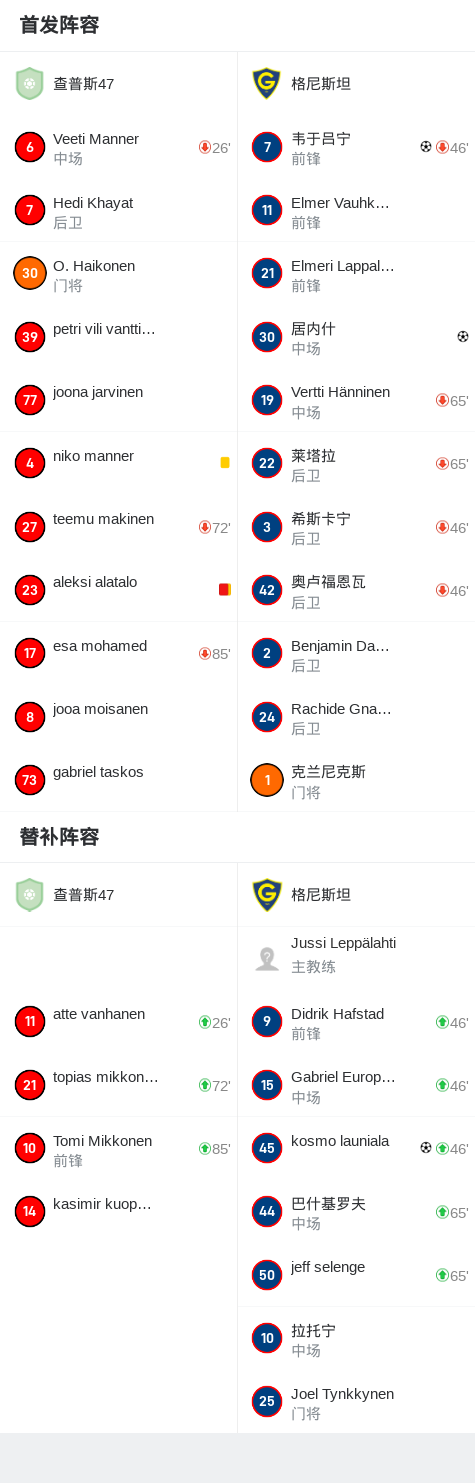第72分钟,查普斯47球队aleksi alatalo吃到第二张黄牌。