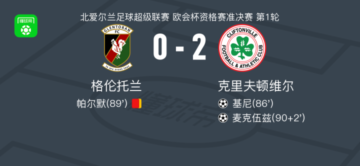 北京时间5月8日,北爱尔兰足球超级联赛欧会杯资格赛准决赛第1轮,格伦托兰主场迎战克里夫顿维尔。比赛中,克里夫顿维尔由基尼打入关键一球,随后格伦托兰的帕尔默因累计两张黄牌被罚下场。比赛临近结束时,麦克伍兹为克里夫顿维尔再下一城。最终,克里夫顿维尔以2-0战胜格伦托兰。