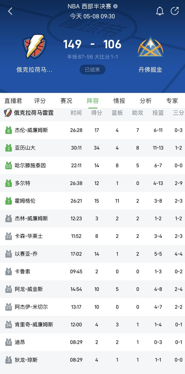 北京时间今日,在季后赛次轮G2中,雷霆队在主场149-106大胜掘金队,总比分扳成1-1。