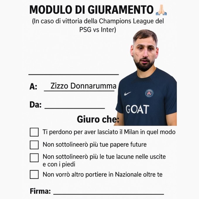 “我可以原谅你当初那样离开米兰” 在周三比赛当晚,社交媒体上流传出一张图片,上面是AC米兰球迷为多纳鲁马准备的“赎罪协议”,并配有多个待勾选的选项。例如:“我原谅你当初那样离开米兰”、“我不会再提你今后的失误”、“我不再强调你在高空球和脚下技术方面的短板”,甚至还有“我不希望国家队门将是别人,非你莫属”。
