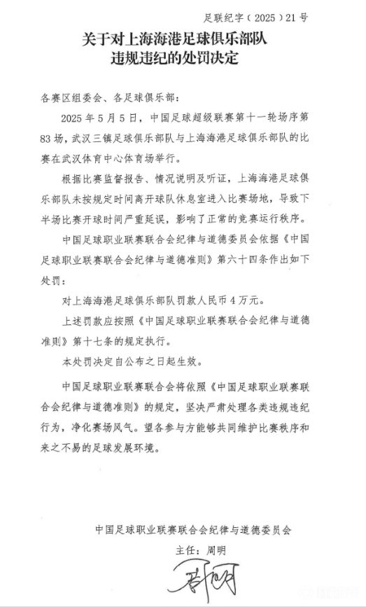 北京时间5月8日,中足联官方发布处罚决定:中超联赛第11轮上海海港队未按规定时间离开休息室进入比赛场地,导致下半场比赛开球时间严重延误,罚款人民币4万元。